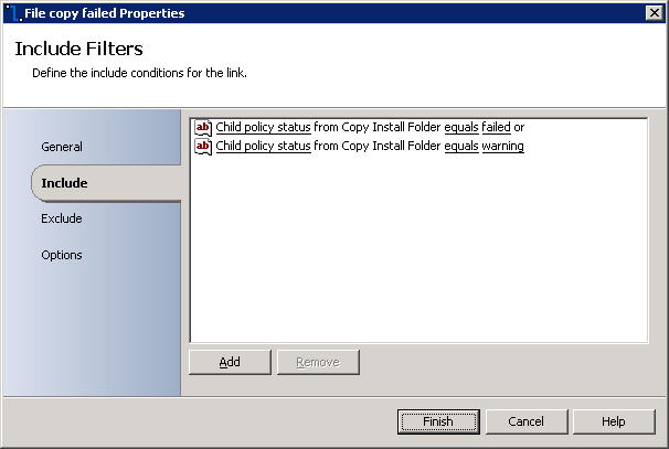 Opalis – Fail a parent policy based on child status WindowsMay 19, 2012February 22, 2013 kevin No comments Set the link from the triggered policy to fail is the Child policy status equals failed or warning. Succeed if the Child policy status equals success. The policy will look like this: Share this:FacebookX
